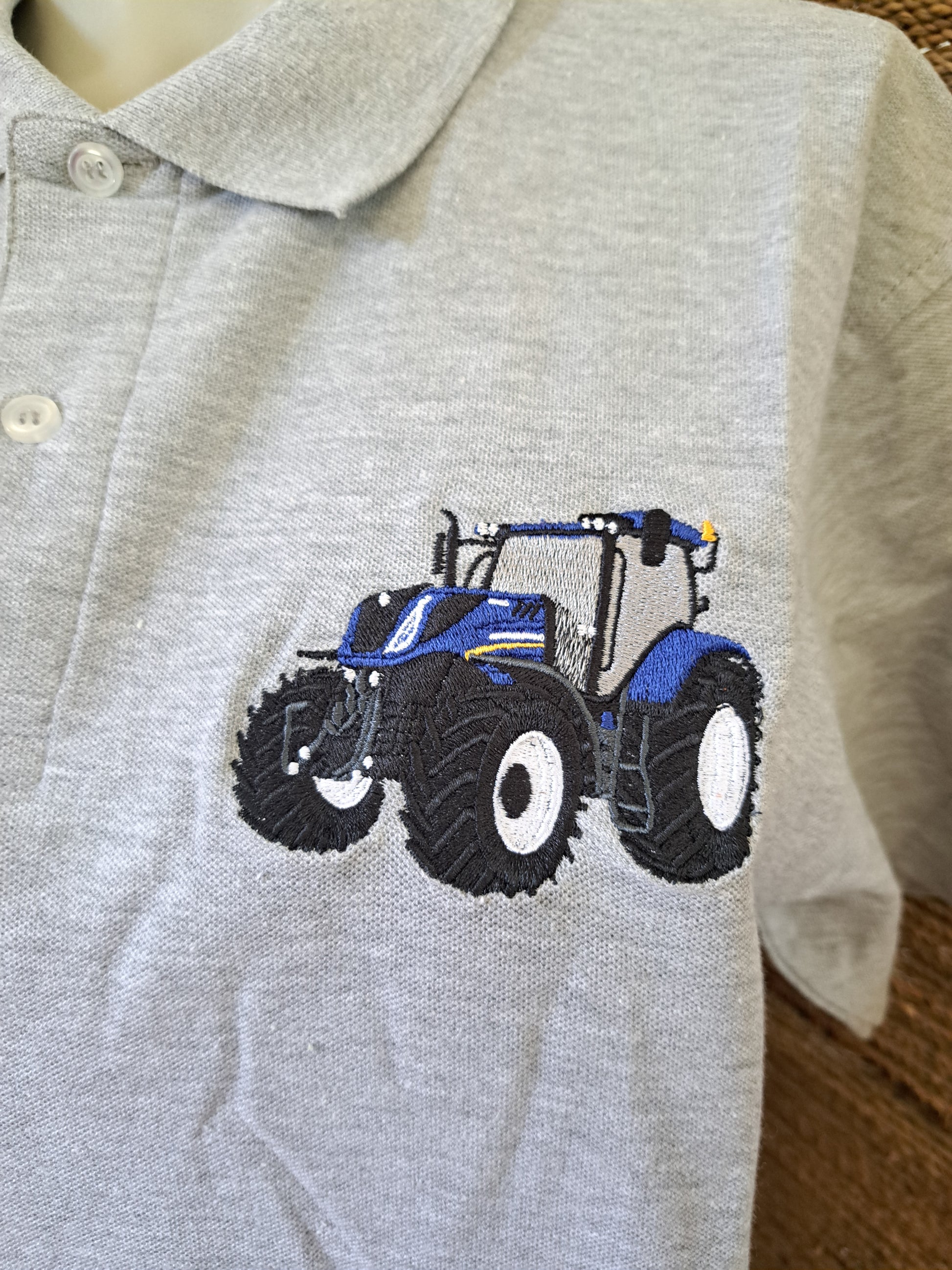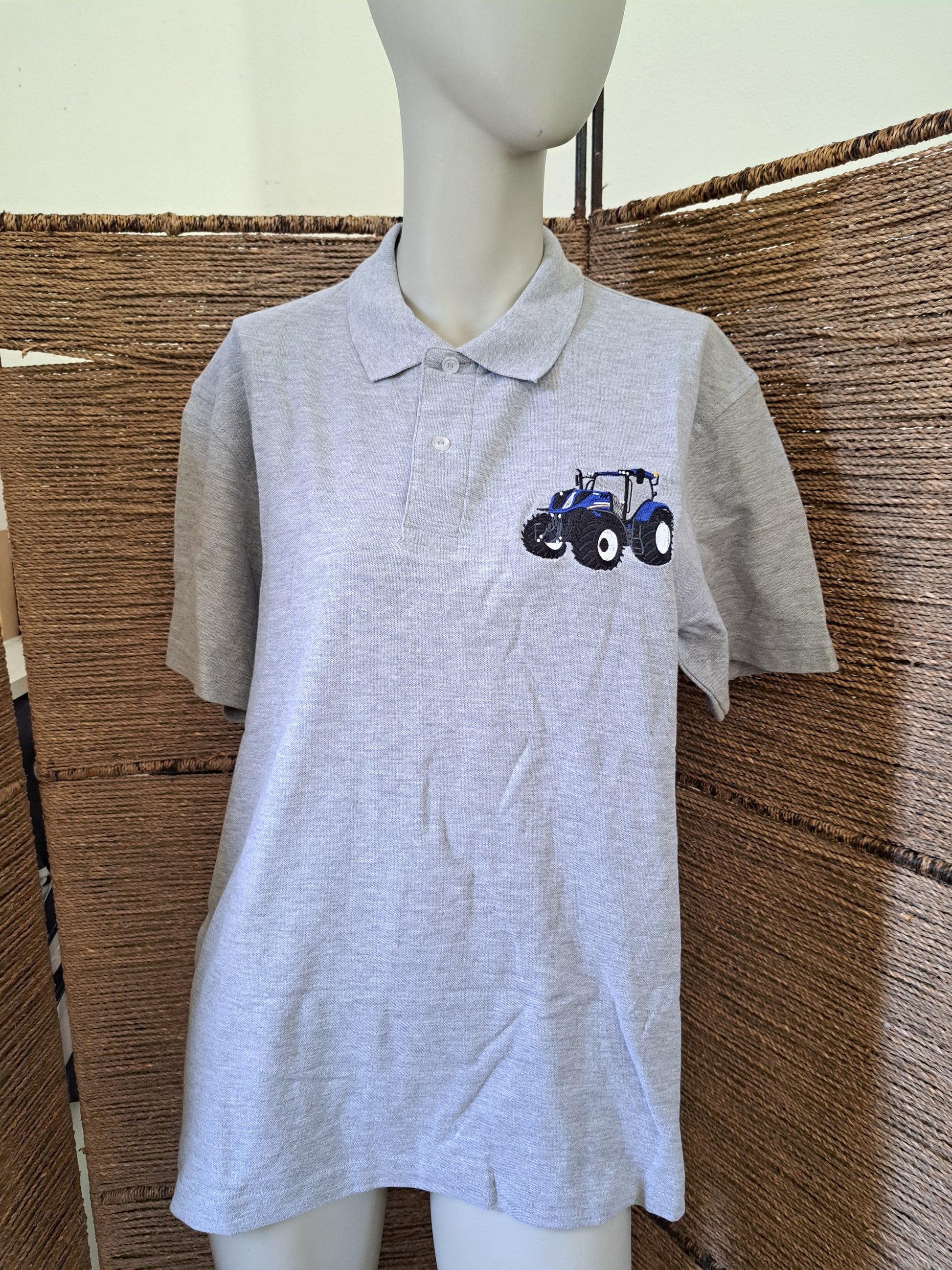 Polo Homme taille M gris avec broderie cœur d'un motif de tracteur New Holland