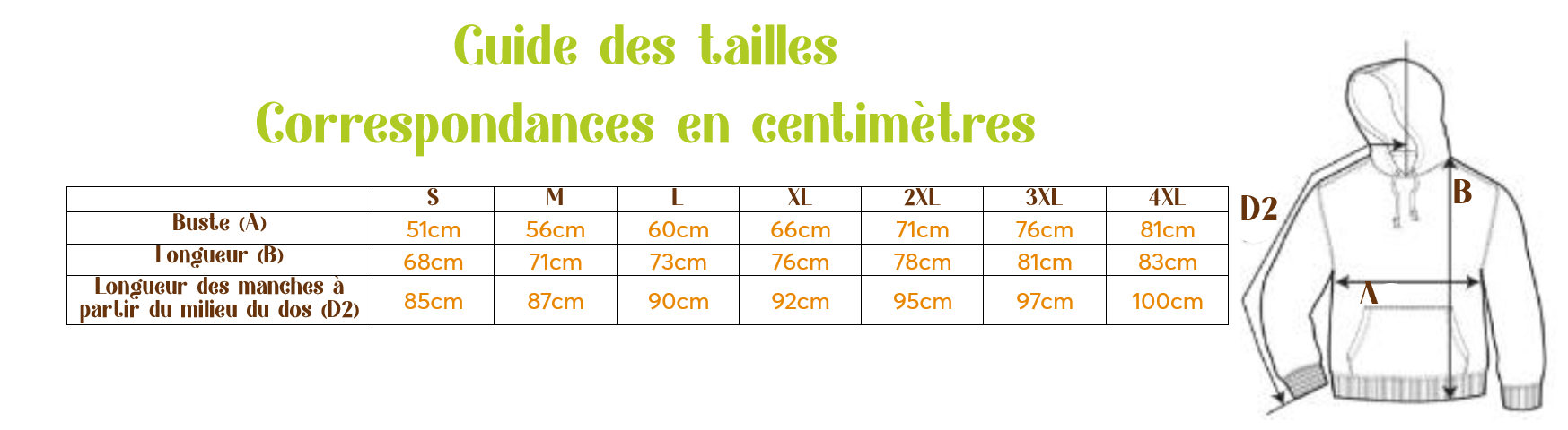 Info pour les femmes : La coupe unisexe va rendre le sweat à capuche un peu plus ample donc si tu souhaites un vêtement près du corps je te conseille de prendre une taille en dessous.