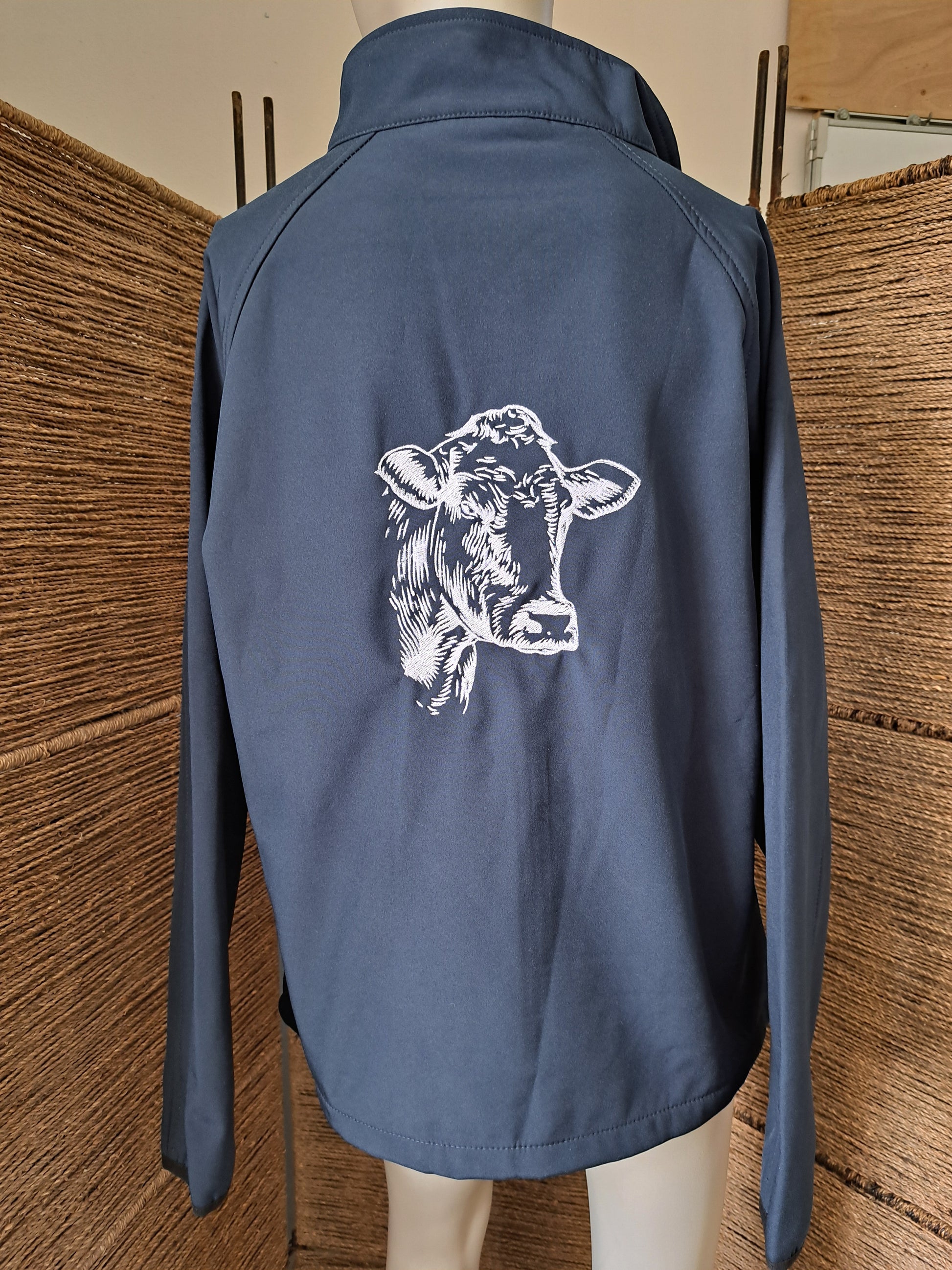 Veste imperméable et polaire marine taille 2XL, coupe femme avec broderie d'une tête de vache en blanc au dos.